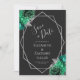 Diese elegante, moderne Hochzeit bewahrt die Dattelkarte mit einem silbernen geometrischen Rahmen, der mit smaragdgrünen und silberfarbenen Blumenbouquets auf schwarzem Hintergrund dekoriert ist. Der anpassbare Text kombiniert silbergraue, weißliche Handschrift, Kupferplatte und kursiven Schriftart. Die Rückseite ist schwarz, schwarz und schwarz.