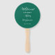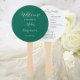 Hochzeitstag-Programm gedruckt auf einem runden Handfächer, der einen trendigen, smaragdgrünen Farbhintergrund auf der Vorderseite mit Braut- und Bräutigamen in weißem, stilisiertem Skript aufweist. Auf der Rückseite des Programms sind die Teilnehmer der Hochzeitsfeier und die Zeremonie-Rites auf weißem Hintergrund mit dunkelgrauer Schrift aufgeführt. Bearbeiten Sie den Handventilator und ersetzen Sie die Informationen zum Hochzeitsprogramm durch Ihre eigenen. Ideal für eine Hochzeitsfeier im Innen- oder Außenbereich! Wählen Sie die gewünschte Anzahl von Hand-Lüfterprogrammen aus.