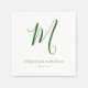 Dieses Hochzeitservieren Design ist einfach, aber elegant. Es bietet einen weißen Hintergrund mit einem dunkelgrünen, handgeschriebenen Monogramm im Smaragdgrün und einem sauberen Text für die Namen der Braut und des Bräutigams und ihren Hochzeitstag.