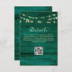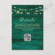 Land, elegant, goldene Saitenleuchten auf rustikalen Holz Smaragdgrün Hochzeitsdetails Karte mit QR-Code für weitere Informationen.