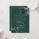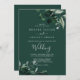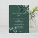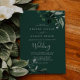 Diese smaragdgrüne Hochzeitskarte ist perfekt für eine Hochzeit. Das elegante und dennoch rustikale Design besticht durch stimmungsvolle, dunkelgrüne Blätter und Eukalyptus mit einem modernen böhmischen Waldgefühl.