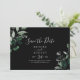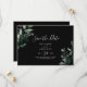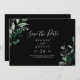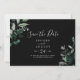 Diese smaragdgrüne, schwarze, waagerechte Save the Date Karte ist perfekt für eine Hochzeit. Das elegante und dennoch rustikale Design besticht durch stimmungsvolle, dunkelgrüne Blätter und Eukalyptus mit einem modernen böhmischen Waldgefühl.