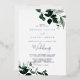 Diese smaragdgrüne Silberfolie-Einladungskarte ist perfekt für eine Hochzeit. Das elegante und dennoch rustikale Design besticht durch stimmungsvolle, dunkelgrüne Blätter und Eukalyptus mit einem modernen böhmischen Waldgefühl. Mit luxuriösem Silberfolientext.