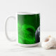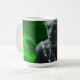 Artistic mug with grayscale female portrait surrounded by glowing emerald green light, symbolizing vitality, mystery, and creative renewal