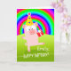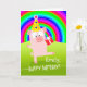 Dancing Party Schwein, Geburtstagskarte mit Bereich, um einen Namen auf das Cover hinzufügen. Digitales Gemälde mit bunten Regenbogen, Schwein mit Geburtstagshut und Geschenk und grünem Gras. Tanz, Tanz, Tanzbotschaft im Inneren. Art, Bild und Vers Copyright © Shoaff Ballanger Studios, 2022.