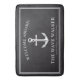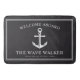 Eine individuell auf den stolzen Besitzer zugeschnittene Badematte. Es verfügt über einen Vintagen nautischen Anker, gefolgt vom Namen des Schiffes, dem Namen des Kapitäns und der Lage des Zuhause-Docks. Das Ganze steht vor einem hellen schwarzen Hintergrund, um Ihr Badezimmer zu ergänzen.