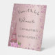 Ein modernes, stilvolles und glamouröses Begrüßungszeichen für eine Quinceañera, 15. Geburtstagsfeier, Pariser Themenabend. Ein rot-rosa metallischer Hintergrund mit rosa glitzernden Herzen und dem Eiffelturm mit einigen Blume. Personalisieren und einen Namen hinzufügen.