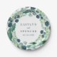 Dieser grüne Kranz ist der perfekte Ort für eine elegante Hochzeitsfeier im Garten. Das moderne botanische Design besticht durch herrliche Aquarellblaue Eukalyptusbäume und grüne Blätter. Diese Teller sind ideal für den Kuchen- oder Desserttisch. Personalisieren Sie sie mit den Namen der Braut und des Bräutigams und dem Hochzeitstag.
