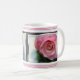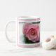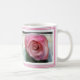 Empfindliche Rose gerahmt mit rosa u. grauer Kaffeetasse