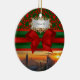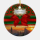NYC Skyline: Empire State Gebäude Sunset, Red & Green Damask, Rot & Green Ribbon Ornament Customizable Ornament mit einem herrlichen Blick auf das Empire State Gebäude, Bank of America Tower und Lower Manhattan einschließlich des World Trade Center während der Sonne untergeht. Es zeichnet sich auch durch ein festliches rotes und grünes Damastmuster für Weihnachten, ein rot-grünes Band, einen roten Bogen, sowie ein weiße Gradientenschild mit der Wahl eines silbernen oder goldenen Aussehens aus. Bitte beachten Sie, dass es sich um ein grafisches Design handelt, das keine wirklichen Stoffe, Metalle oder Prägungen enthält. 2012 ©NYCisMyMuse Alle Rechte vorbehalten