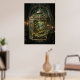 A miniature enchanted forest lives within an ornate antique birdcage, creating a captivating fusion of object and environment. Inside, tiny trees, winding paths, glowing lanterns, and reflective ponds form a rich, immersive landscape filled with detail and atmosphere. The aged metal cage, with its intricate design and soft patina, frames the scene like a delicate work of art. Mist and soft lighting enhance the magical mood, blending elegance with fantasy storytelling. This unique artwork is perfect for interiors seeking charm, mystery, and a refined fairytale aesthetic.