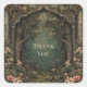 Step into a realm of fairytale magic with this enchanting forest thank you sticker. The design features a breathtakingly detailed, painterly illustration of a mystical woodland entrance. An ornate archway, intricately crafted from ancient, gnarled trees and vine-covered stone, frames a deep, mysterious forest clearing bathed in soft, ethereal light. The foreground is a tapestry of lush, natural detail, featuring a moss-covered path winding through abundant wildflowers in soft pinks and creams, vibrant green ferns, intricate foliage, and charming mushrooms. This sticker captures the essence of a hidden, magical world. These stickers are perfect for businesses that evoke storytelling, fantasy, and natural beauty, such as fantasy authors or illustrators, boutique bookstores, artisans specializing in fairytale crafts, rustic or woodland-themed event planners, or unique gift shops. This versatile design can also be used to beautifully seal envelopes for fairytale weddings, themed parties, or as a sophisticated accent on party favors and gift wrapping.