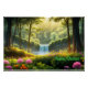 Step into a dreamlike world of light and tranquility with this breathtaking forest landscape. Sunbeams filter through ancient trees, illuminating a gentle waterfall that flows into a calm, reflective pool. The foreground bursts with colorful wildflowers in pink, orange, and yellow, while golden light dances across the foliage.
