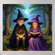 This whimsical poster features two young apprentice witches sitting on a wooden bench in an enchanted forest at night. One wears a black cloak and hat while holding a glowing lantern, the other wears a purple robe and reads from a spellbook. The scene is illuminated by fireflies and a crescent moon, with tall trees creating a magical atmosphere. Finished as a watercolor art print.