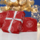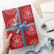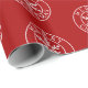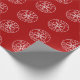 This wrapping paper features a simple geometric snowflake within white circles with Merry Christmas between the inner and outer circles on a deep red background. Featuring original art from Dogwood & Thistle.