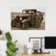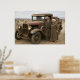 An elderly couple stands beside a rusty vintage truck on a dirt road, with a vast open landscape in the background. Both are dressed in earth-toned clothing that matches the rugged, natural setting.