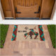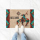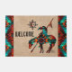 Personalisieren Sie dieses einzigartige "One of a Art" Ende der Trail Doormat! Es verfügt über ein südwestliches Indianerende Ende des Trails indisch und Pferd unter der Sonne auf einem Tan Hintergrund...Umgeben von einer Südwestgrenze in Türkis, Orange und Schwarz! Das ist ein originelles Kunstdesign des Künstlers Kerry Miller.