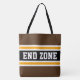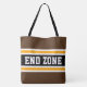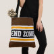 Dieses sportliche Design zeichnet sich durch einen fett formatierten Text in der ENDE ZONE in einem breiten schwarzen, horizontalen Mitte-Rennstreifen aus, hervorgehoben mit schwebenden weißen und goldgelben Pinstripes gegen athletisch braune äußere Streifen. Der Text kann personalisiert sein.