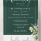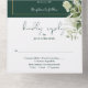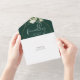 Alles in einer vertagten Hochzeitseinladung mit botanischen grünen rustikalen Blätter, die auf einem goldenen Bogen fallen und elegante Typografie auf einem smaragdgrünen Hintergrund beinhalten. Die Einladung enthält eine perforierte RSVP-Karte, die für Sie individuell adressiert oder links als leere Karte für die Handschrift der Adressdaten Ihres Gastes verwendet werden kann. Entwickelt von Thisisnotme©