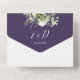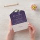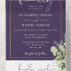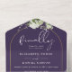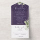 Alles in einer aufgeschobenen Hochzeitseinladung mit botanischen grünen rustikalen Blätter, die über einen goldenen Bogen fallen und elegante Typografie auf einem lila Hintergrund beinhalten. Die Einladung enthält eine perforierte RSVP-Karte, die für Sie individuell adressiert oder links als leere Karte für die Handschrift der Adressdaten Ihres Gastes verwendet werden kann. Entwickelt von Thisisnotme©