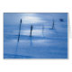 Bootsanlegestelle im Winter, gefroren und mit schönem blauem Eis bedeckt, mit Sonnenreflexion. Fotografie.