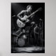A guitarist explodes into motion, playing an electric guitar, with a full band in the background. Dramatic lighting and monochromatic tone capture the intensity of a live show.