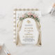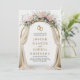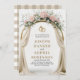 Engagement party invitation with elegant floral arch design. Features pink and white flowers, green leaves, and gold rings. Names and details in gold text.