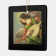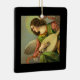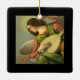 wunderschöne Renaissancemalerei eines Engels mit braunen lockigen Haaren, Flügeln, Heiligenschein, glänzendem rosa Band, der ein liebevolles rosa Hemd, ein wunderschönes grünes Kleid mit goldenem Kragen und schöne grazile Hände mit Fingern trägt, die eine auf ihrem Schoß liegende Mandoline zupfen, und der scheint, als ob sie darüber steht und nach unten schaut. detailliertes, delikates und friedliches Bild in sanften Grüntönen und Rosatönen.
