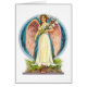 Retro aussehender Engel mit spitzen Sandeln, lilly Blume Kleid, Kopfband mit Blume, und mit einem Haufen Lilien in ihren Händen und Armen, hinter dem Engel ist eine große blaue Scheibe mit Pflanze, sie hat große rosa Flügel und schaut direkt auf den Beobachter.Engel mit langes Kleid aus weißen lilly Blume Blättern, die süß mit Füßen auf einem Pfad umgeben von Gras und tragen Die Vintage Aquarellmalerei von Osterengel mit traditionellen Osterfarben, pastellfarbene Pastelltöne in Blau, Weiß und Rosa.