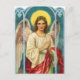 Vintages Engelgemälde mit einem großen roten Band, schöner weißer Smock mit Goldbespannungen und Händen im Gebet