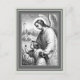 Ein schöner Vintager Schwarz-Weiß-zeichn eines männlichen Engels mit Flügeln und Halo, der ein kleines Kind an den Armen hält, als würde er davon abhalten, etwas zu tun oder irgendwo hin zu gehen, und mit Landschaft im Hintergrund, mit Gebäude, Bäumen und Bergen und Blume im Vordergrund. Ein Kinderkind, das kurz davor steht, auszubrechen und ein Schutzengel zu haben, um ihn davon abzuhalten, dorthin zu gehen und das Kind vor Schaden zu schützen.