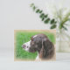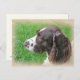 Diese niedliche Hundescharte zeigt das Profil eines bezaubernden Leber und weißen englischen Springer Spaniers, der im Gras liegt.
