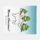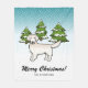 Desteis originelle Cartoon Illustration einer niedlichen englischen Creme Golden Retriever Rasse Hund. Der Hund ist in einer kalten Winterszene untergebracht. In der Szene schneit es im Hintergrund und hinter dem Hund stehen drei grüne Tannen. Die Bäume haben Schnee auf ihnen. Der Hintergrund ist ein hellblau bis weiß Gradienten, die dieses Design, dass Frost kalten Winter-Tag aussehen. Es gibt auch einen personalisierbaren Textbereich, der jetzt "Frohe Weihnachten!" in einem schönen Script-Schriftart liest. Darunter befindet sich ein weiterer personalisierbarer Textbereich für einen Familiennamen oder einen anderen benutzerdefinierten Text.