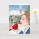 Handgezeichnete Kunst. Der erste Schnee. Eine Dame, die einen Kardinal an einem schneebedeckten Wintertag vor einer englischen Hütte hält. Leere Karte.