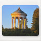 Blick aus dem Monopteros, einem offenen, runden Tempel, der 1836 im griechischen Stil von Leo von Klenze erbaut wurde. An der Decke hängen gewitterte Bilder. In einem öffentlichen Park gelegen, der Englische Garten, München, Oberbayern, Deutschland.