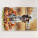 Ein Aquarellbild eines fröhlichen Hundes inmitten eines Haufen lebendiger Herbstlaub, umgeben von winzigen Kürbissen und verstreuten Eichhörnchen. Der Hund trägt einen kleinen Pilgerhut und strahlt vor Freude aus, um den Geist des Erntedanks zu erfassen. Im Hintergrund sorgen weiche Erntefelder und goldfarbene Bäume für eine friedliche Landschaft. Die sanfte Struktur und die warmen, gedämpften Herbsttöne verleihen der Szene ein gemütliches, nostalgisches Gefühl, das perfekt ist, um die Schönheit der Saison zu feiern.
