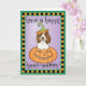 Senden Sie Halloween-Grüße mit dieser Karte eines niedlichen Springerwelpen in einer lächelnden Kürbislaterne. Groß für Kinder alles Alters das Liebe englischer Springer-Spaniels und Halloween. Haben Sie ein glückliches Heulen-oween!