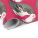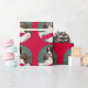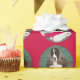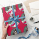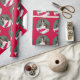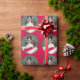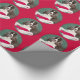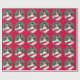 Dieses ist eine Rolle des roten Feiertagsverpackungspapiers, das eine ursprüngliche Fotografie einer Leber und weißen des englischer SpringerSpaniel kennzeichnet, die mit einer Weihnachtsmannmütze sitzen.