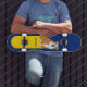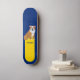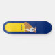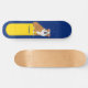 Dieses Skateboard zeigt ein englisches Bulldogge-Set vor einem königsblauen und hellgelben Hintergrund und ist bereit, mit einem Namen oder einem anderen Text in königsblauer Schrift personalisiert zu werden.