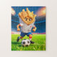A friendly fish‑and‑chips character wearing an English soccer jersey stands confidently on a bright stadium field. The illustration uses clean vector‑like lines, expressive eyes, and soft 3D shading. Detailed grass and stadium lighting create a lively soccer mood.