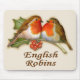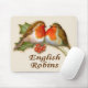 Zwei plump Englisch Robins sitzen auf einem Holly Zweig mit roten Beeren. Text sagt Englisch Robins.