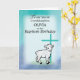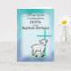 Passen Sie diese Karte mit dem Namen Ihrer Enkelin an, wenn Sie ihre besonderen Segnungen auf ihrer Taufe zum Geburtstag schicken! Vor einem aquamarinen Kreuz ist ein Lammfleisch stehend. Der lila und Lavendelhintergrund verblasst in einem Aquarellbild in aquamarin und grün.