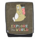 Boho im skandinavischen Stil mit Köcher, mit mehrfarbigem "Explore the World" Text auf rustikal braunen Burlap Blick Hintergrund