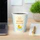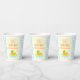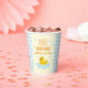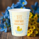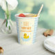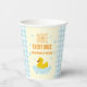 Eine glückliche Ente! Erster Geburtstag mit einer Gummiente und Bläschen gegen einen hellblauen Gingham und blassgelben Hintergrund mit orangefarbenem Text