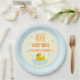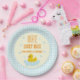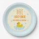 Eine glückliche Ente! Erster Geburtstag mit einer Gummiente und Bläschen gegen einen hellblauen Gingham und blassgelben Hintergrund mit orangefarbenem Text