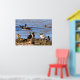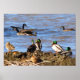 Dieses Poster zeigt eine künstlerische Darstellung einer Linie von Mallard Ducks, die am Ufer des Cayuga Sees aufgestellt wurde und dabei zusah, wie die kanadischen Gänse im blau-hackigen Wasser schwimmen. Eine tapfere weibliche Ente hat sich den Gänsen angeschlossen. Die männlichen Enten lassen sich durch ihre irisierenden grünen Köpfe und gelben Schnüre erkennen. Die Weibchen haben schöne Federn in Brauntönen, Gold und Orangen Schnäbel. Lange schwarze Hals mit einem weißen Streifen kennzeichnen die Gänse.