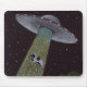 Ein Farbstift, der von einer unglücklichen Kuh zeichne, die von Außerirdischen in einer fliegenden Untertasse in einer dunklen, sternigen Nacht entführt wird. Die verängstigte Herde kauert im Hintergrund.