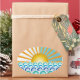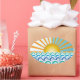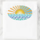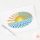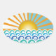 Ovaler Aufkleber mit verschiedenen Farbtönen von blauen Wellen mit heller Sonne am weißen und blauen Horizont.