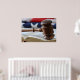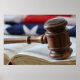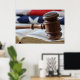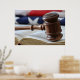 Der hölzerne Richter schlug auf eine Bibel. Hintergrund der amerikanischen Flagge.