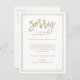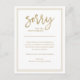 Diese einfache und elegante Ankündigungskarte ist eine Möglichkeit, sich bei Kunden oder Freunden zu entschuldigen, wenn Sie eine Veranstaltung oder Hochzeit absagen, umplanen oder verschieben müssen. Moderne, Imitate Gold-Look handgeschriebene Skript fügt eine stilvolle Touch, während der rechteckige Goldrahmen fügt ein formales und klassisches Aussehen. Verwenden Sie diese Ankündigungskarten für Stornierungen, Verspätungen oder Umschuldungen.